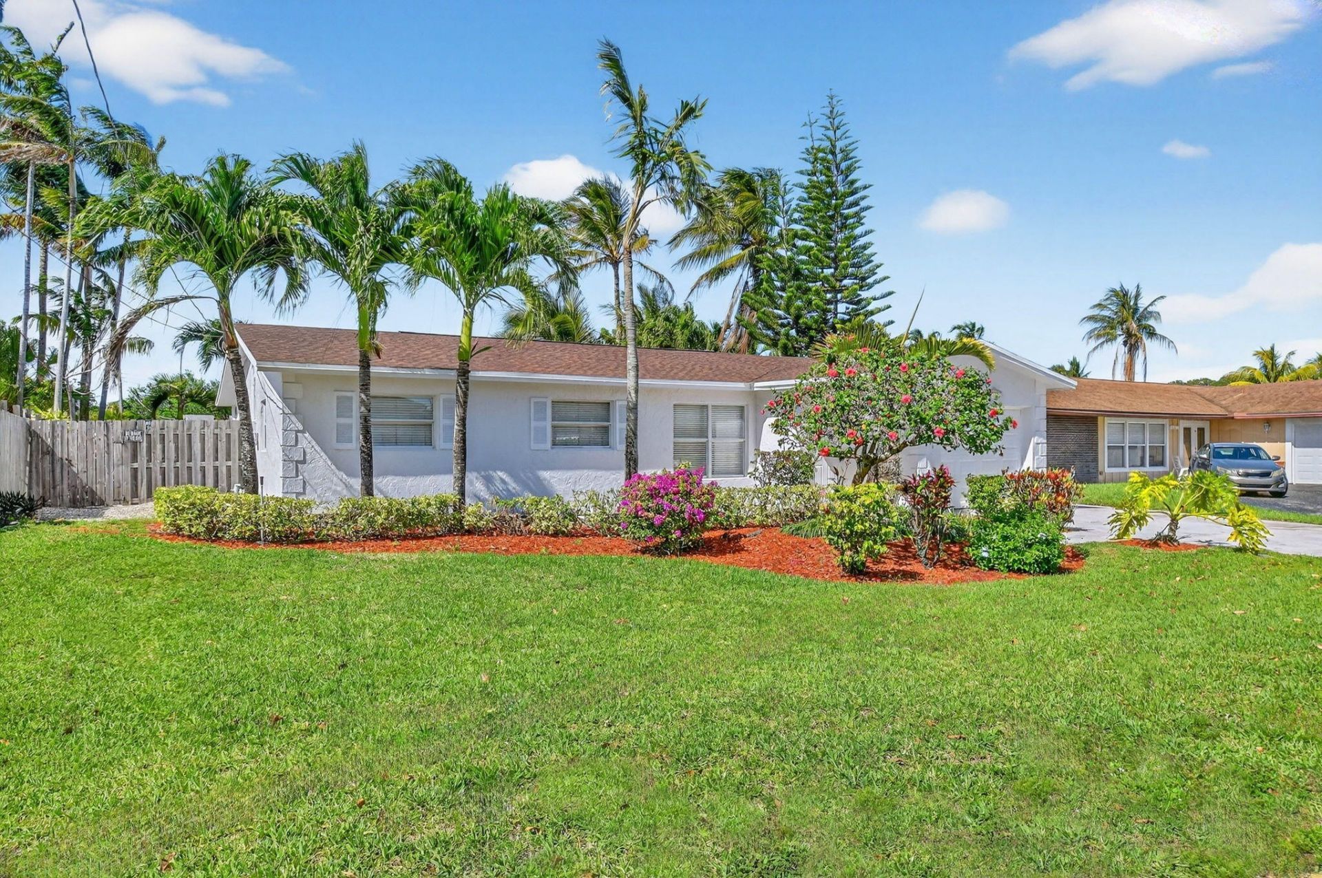 This waterfront home on the canal features a boat lift and a jet ski lift. The three-bedroom, two-bathroom house has been freshly painted inside and out, with new carpeting in the bedrooms. Upon entry, you see tropical landscaping, an inviting pool, the dock, and the canal. The waterway provides access to Lake Ida, Lake Osborne, and beyond. The extended driveway offers plenty of room for guests, RVs, or additional toys. The best part is that there is no HOA. The water heater is new. Public records show reroof in 2020. The dock is about 68 feet long and has electricity.