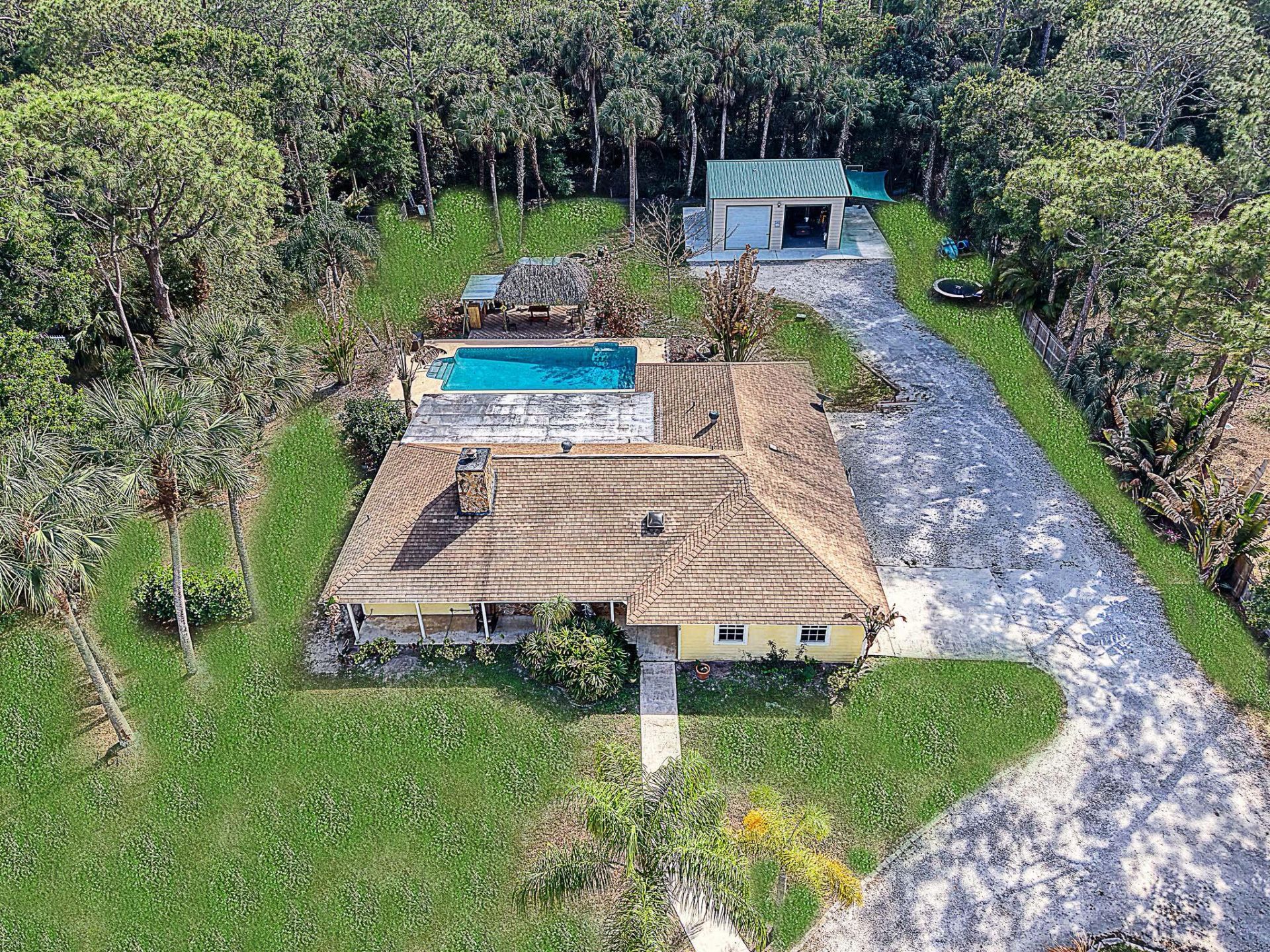 Welcome to this private Jupiter Farms retreat situated on a 1.2-acre lot offering space, privacy, and the perfect setup for outdoor living and hobbies. The property is fully fenced with an electric gate, providing both privacy and security. This 3-bedroom, 2-bath home features an attached 2-car garage plus a detached 30x30 garage/workshop, ideal for car enthusiasts, storing boats or RVs, or creating the ultimate workshop. The detached garage includes 220-volt electric and an air compressor, providing excellent functionality for projects and equipment. Inside, the home offers comfortable living spaces with a cozy fireplace and an updated kitchen featuring granite countertops and stainless steel appliances. Recent upgrades provide peace of mind, including new windows and doors installed in 2025, a custom master closet completed in 2025, a renovated master bathroom, and a guest bathroom updated in 2025. Step outside to your private backyard oasis designed for entertaining and relaxation. Enjoy the screened patio overlooking the pool, unwind in the hot tub, gather under the tiki hut, or relax around the fire pit. The expansive property offers plenty of room for outdoor activities while maintaining the peaceful lifestyle Jupiter Farms is known for. Located just a short drive from beaches, shopping, dining, and major highways, this property offers the perfect balance of country living with modern conveniences.