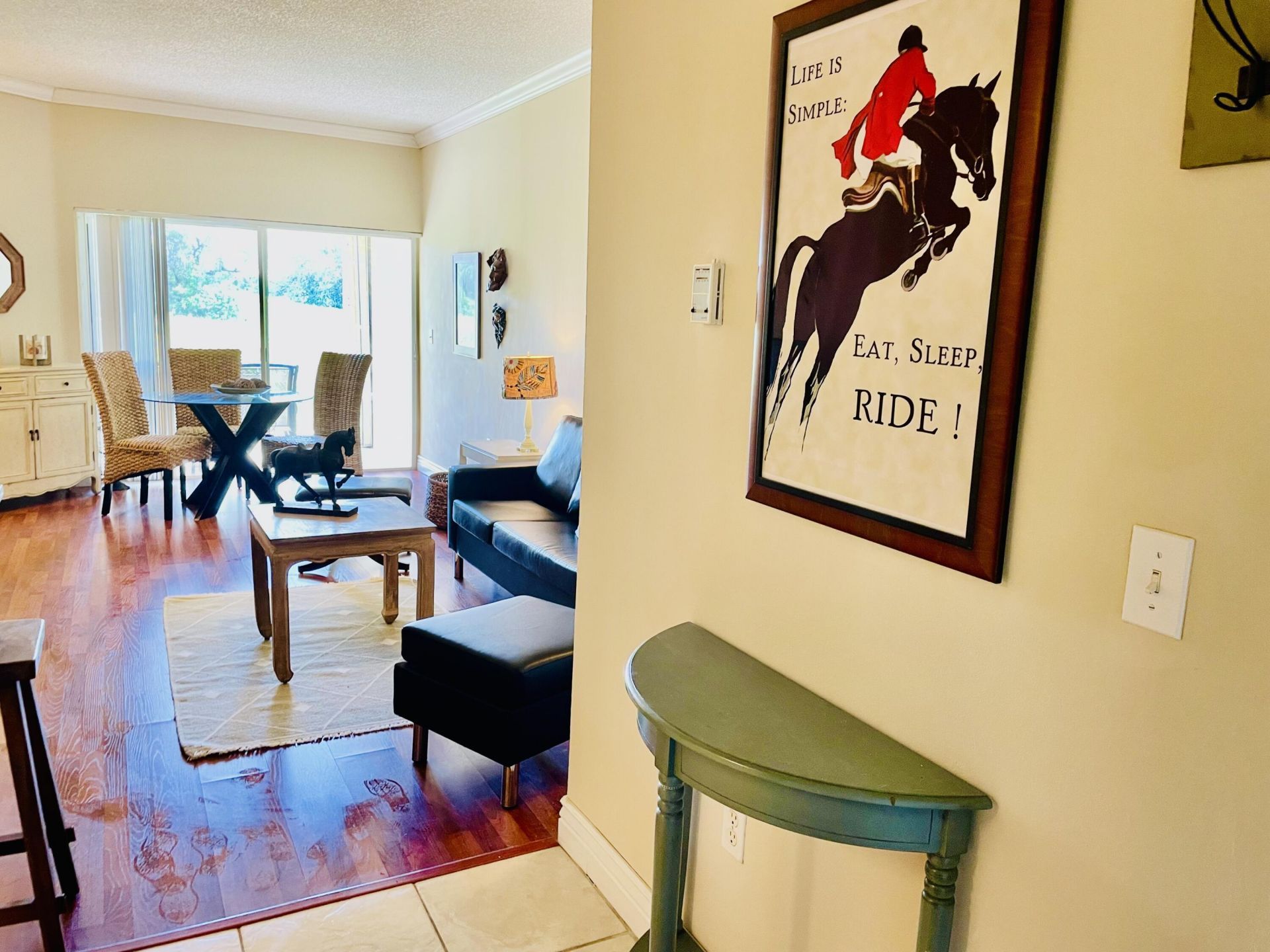 Charming Furnished 1 Bedroom 1Bath in unit ground floor with canal and golf views in gated community. Garage steps away. Close to equestrian facilities.