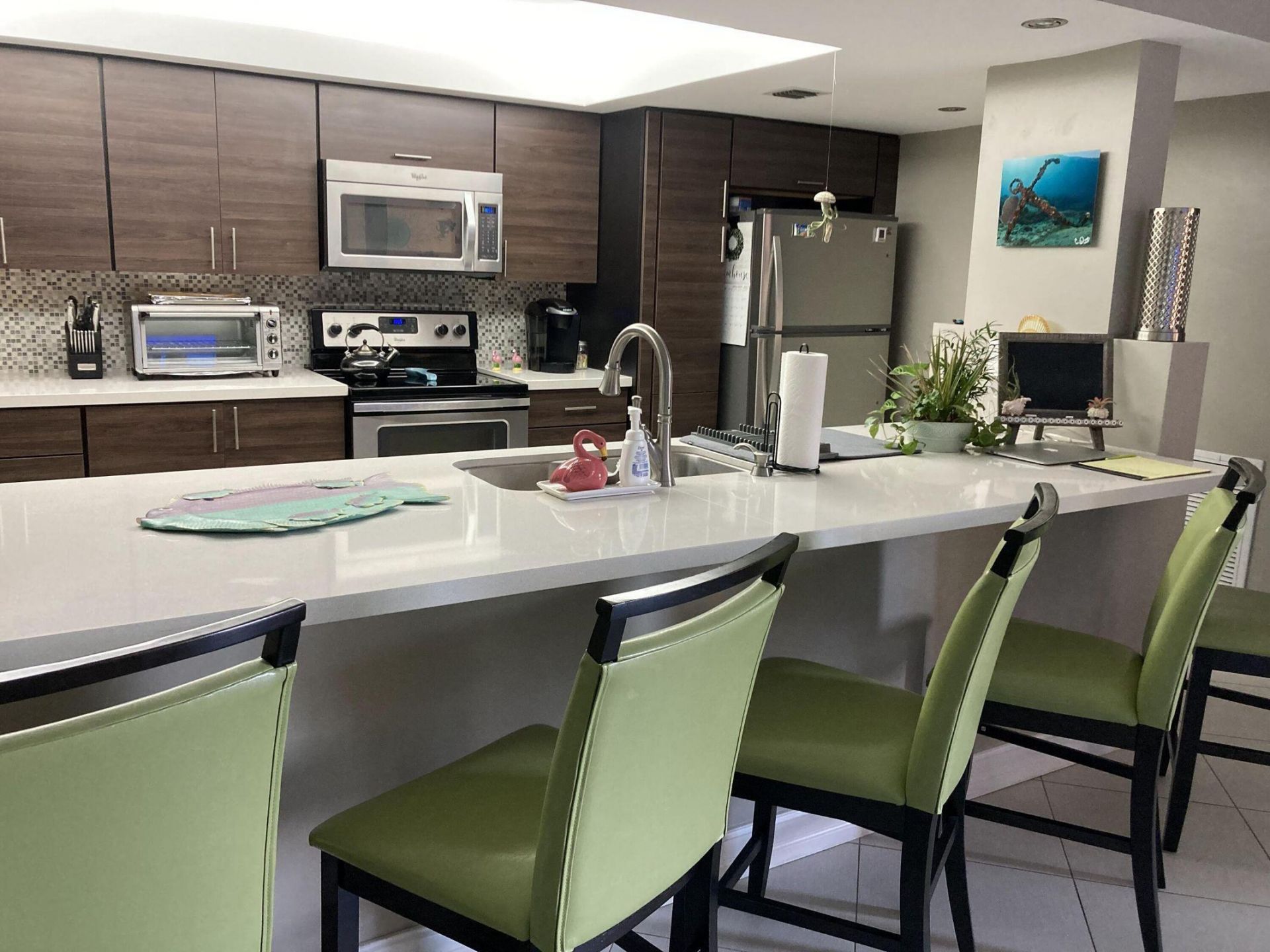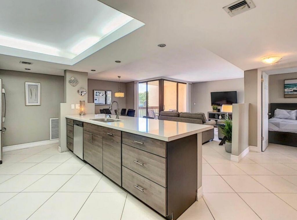 This beautifully remodeled unit offers luxurious touches at every turn. The kitchen has been redesigned to seamlessly flow into the dining area and living room, making it perfect for both cooking and entertaining. All cabinetry is custom-made with meticulous attention to detail, featuring soft-close technology for a quiet, smooth operation. The full-sized washer and dryer add convenience, while the guest bedroom is furnished with both a queen and a full bed. The guest bathroom has been completely renovated, showcasing a luxurious rain shower. The master bedroom boasts a king-sized bed with upscale bedding, along with a remodeled ensuite bathroom and a spacious walk-in closet. Enjoy breathtaking lake views from the screened-in balcony. Walk to Whole Foods, Target & shops. 1 mile to beach
