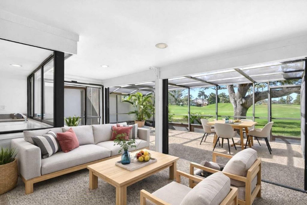Deer Creek fairway home in sought-after THE HOLLOWS! This 3BR/2BA residence features a wide-open floor plan w/ soaring 14' ceilings & abundant natural light. Oversized great room flows into formal DR and covered patio-perfect for entertaining. Chef's kitchen offers newer S/S appliances, quartz counters, white shaker cabinets, large pantry, and pass-through to patio. Spacious corner primary suite boasts luxury vinyl plank flooring, a large walk-in closet, & bath w/ tiled shower & sweeping FAIRWAY VIEWS. Split-bedroom layout provides guest privacy. Enjoy endless sunsets from the screened and covered lanai overlooking the 4th fairway! Inside laundry, 2016 A/C, new electric panel, hurricane-rated garage door. No equity membership required. Low HOA includes lawn care. Minutes to sandy beaches.