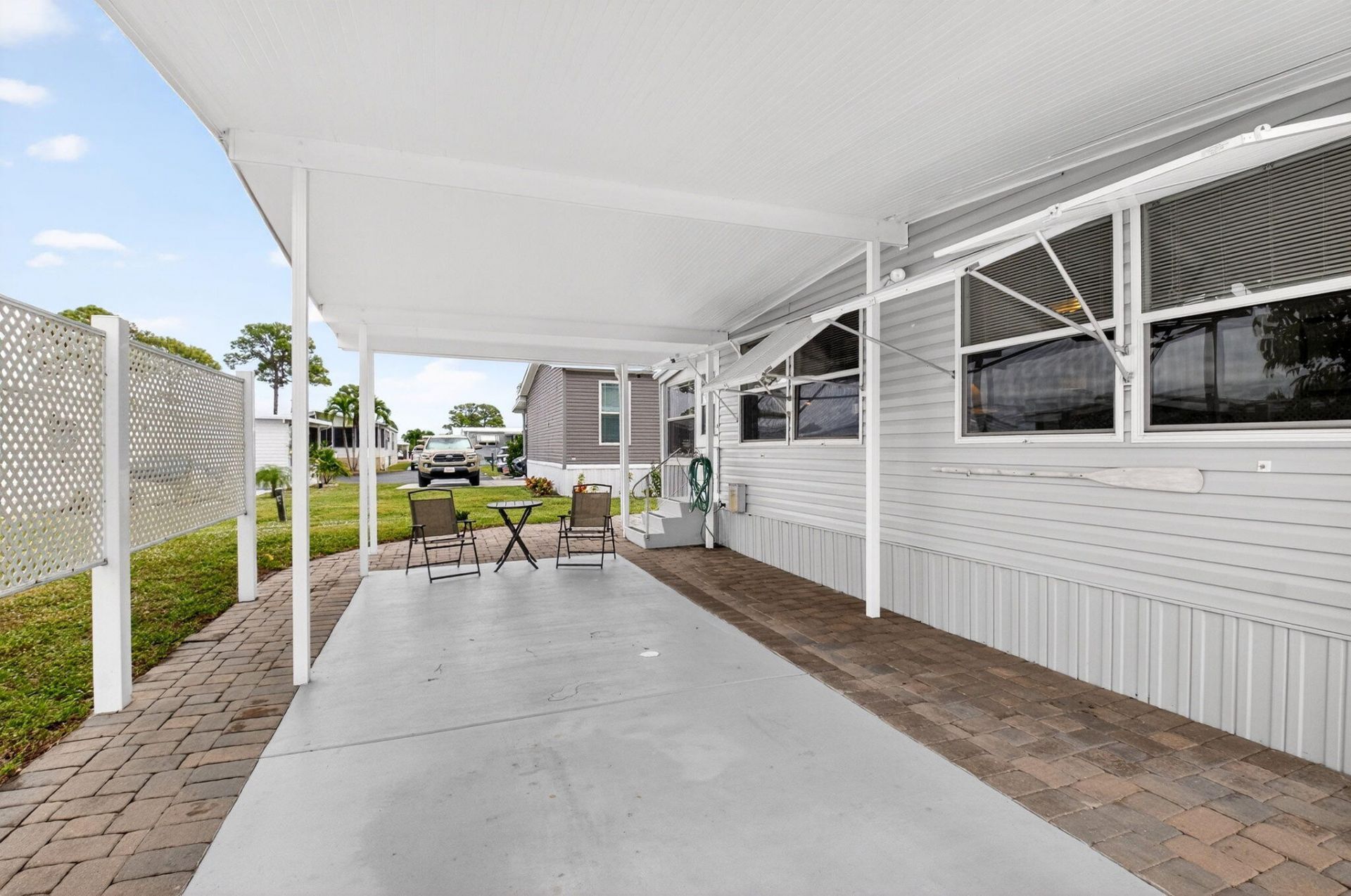 This beautifully maintained and fully furnished 2 bedroom, 2 bath home offers comfort and privacy, with NO land lease. Tucked at the end of a quiet cul-de-sac, the property enjoys abundant green space and a peaceful setting. Inside, the home features tile flooring throughout and drywall-finished walls and ceilings, creating a warm, modern atmosphere. The updated kitchen includes shaker-style cabinetry and stainless steel appliances, while both bathrooms have been tastefully renovated with tile shower in guest bath. An open floor plan connects the kitchen, dining area, and spacious living room, making the home feel bright and inviting. Additional upgrades include a newer A/C system, hot water heater, and a double roof. Both bedrooms are generously sized and furnished with king size beds. A large, sunlit Florida room provides extra living space to relax or entertain, can be used as 3rd Bedroom. Outside, the property continues to impress with a roomy patio area perfect for outdoor enjoyment, along with a convenient storage shed. This home is truly move in ready and waiting for you. Just bring your suitcase and settle right in. Enjoy Florida living in this gated community with plenty of activities, 2 heated pools, pickleball courts, shuffleboard, billiards, library and so much more. Low monthly fee includes water, sewer, fiber optic internet, lawn care, manager on site and an array of activities. Located close to dining, shopping and the local beaches.